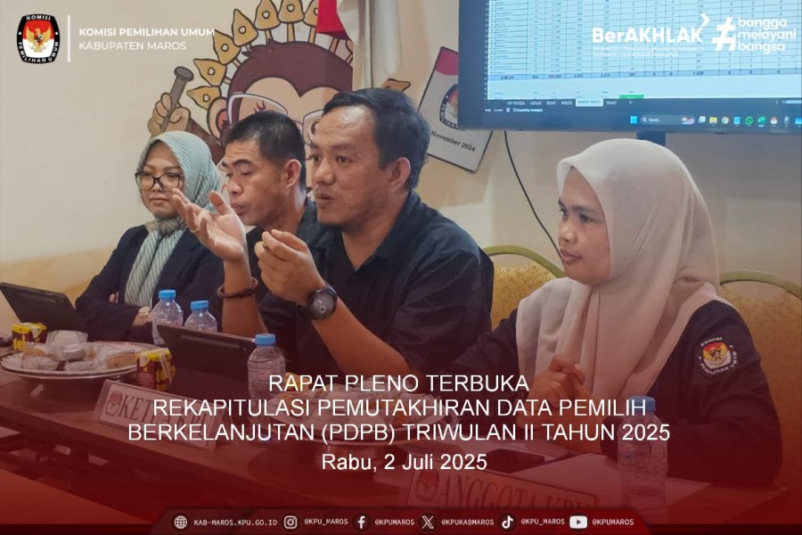 kab-maros.kpu.go.id - Aula Mini Kantor Komisi Pemilihan Umum (KPU) Kabupaten Maros, Kamis 02 Oktober 2025 Melakasanakan Rapat pleno Terbuka Rekapitulasi Pemutakhiran data Pemilih Berkelanjutan (PDPB) Triwulan III tahun 2025 sebagai Upaya memelihara, Menjamin akurasi dan validitas data pemilih secara berkelanjutan agar daftar pemilih selalu mutakhir, akurat, dan dapat dipertanggungjawabkan dengan Mengidentifikasi perubahan data kependudukan baik pemilih baru, pemilih pindah domisili, pemilih meninggal dunia, TNI/Polri aktif, dan peubahan status lainnya. Keterangan Gambar : Infografis Rekapitulasi Pemutakhiran Data Pemilih Berkelanjutan Kabupaten Maros Provinsi Sulawesi Selatan Triwulan III Tahun 2025 Kegiatan ini di hadiri oleh komisioner KPU Kabupaten Maros, Forkopinda, TNI/POLRI, Disdukcapil Maros, Bawaslu, dan Pemerintah Kabupaten Maros dengan hasil jumlah pemilih Laki-laki sebanyak : 136.366 Pemilih dan Perempuan Sebanyak :147.343 Pemilih dengan Jumlah 283.709 Pemilih. Selanjutnya penyerahan Berita Acara (BA) Rekapitulasi Pemutakhiran data Pemilih Berkelanjutan (PDPB) kepada Peserta Rapat sesuai dengan Amanah Undang-Undang. (@yu / M@2L ) Unduh dokomen disini ....