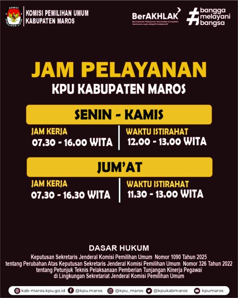 Berikut Kami Sampaikan jadwal jam kerja di lingkungan Sekretariat KPU Kabupaten Maros: ????️Senin s.d. Kamis Jam Kerja: 07.30 – 16.00 WIB Waktu Istirahat: 12.00 – 13.00 WIB ????️Jum’at Jam Kerja: 07.30 – 16.30 WIB Waktu Istirahat: 11.30 – 13.00 WIB ....