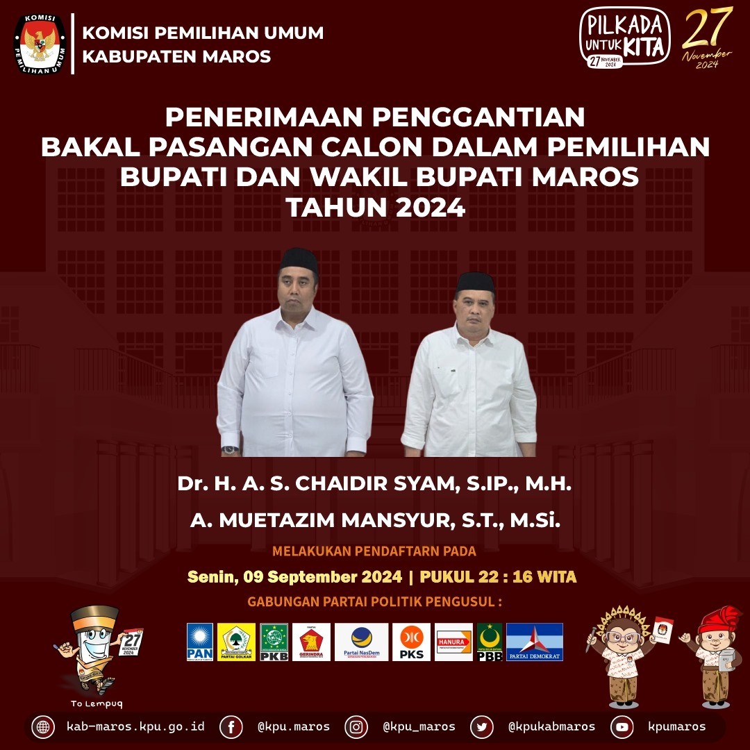 Dari hasil penerimaan berkas Pengajuan Penggantian Bakal Pasangan calon dalam Pemilihan Bupati dan Wakil Bupati Maros tahun 2024 Yaitu Dr. H. A. S. Chaidir Syam, S.IP., M.H. dan A. Muetazim Mansyur, S.T., M.Si. , Terdapat Sembilan ( 9 ) Partai yg Mengusun Kembali Bakal Pasangan Calon Yaitu:Partai NasDem ,Partai Hati Nurani Rakyat,Partai Keadilan Sejahtera,Partai Amanat Nasional,Partai Kebangkitan Bangsa,Partai Golongan Karya,Partai Gerakan Indonesia Raya,Partai Demokrat,Partai Bulan Bintang.