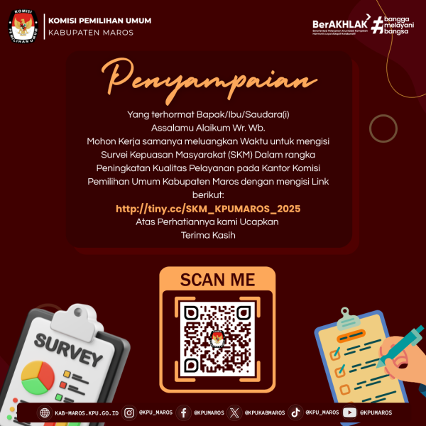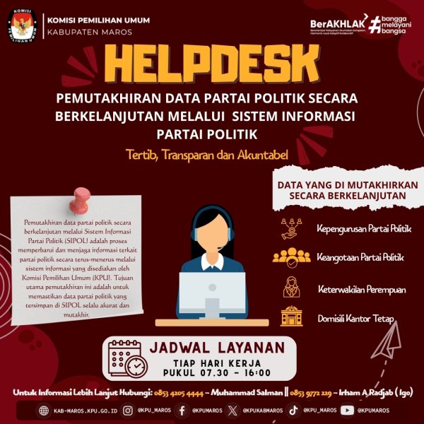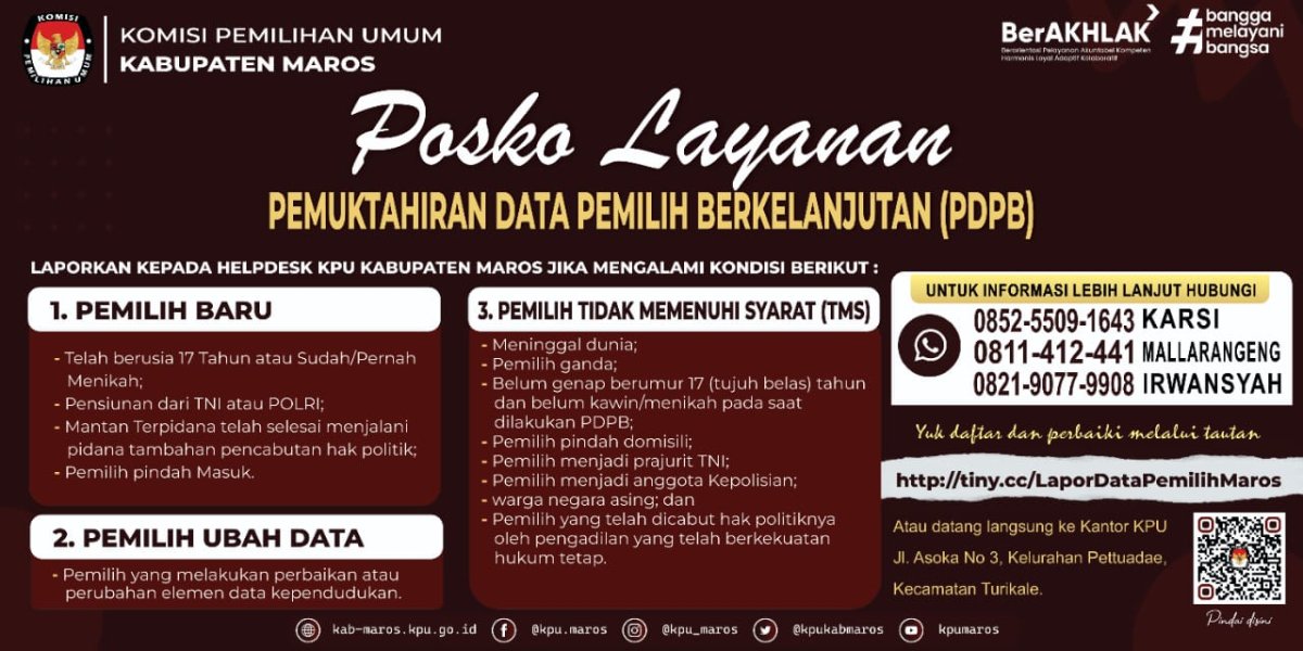 #TemanPemilih-Dalam rangka menjaga akurasi dan validitas data pemilih pasca Pilkada Serentak 2024, KPU Kabupaten Maros membuka Posko Layanan Pemutakhiran Data Pemilih Berkelanjutan (PDPB) berdasarkan PKPU Nomor 1 Tahun 2025 tentang Pemutakhiran Data Pemilih Berkelanjutan.