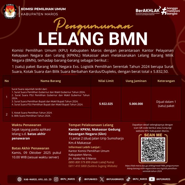 Komisi Pemilihan Umum (KPU) Kabupaten Maros dengan perantaraan Kantor Pelayanan Kekayaan Negara dan Lelang (KPKNL) Makassar akan melaksanakan Lelang Barang Milik Negara (BMN), terhadap barang-barang sebagai berikut: