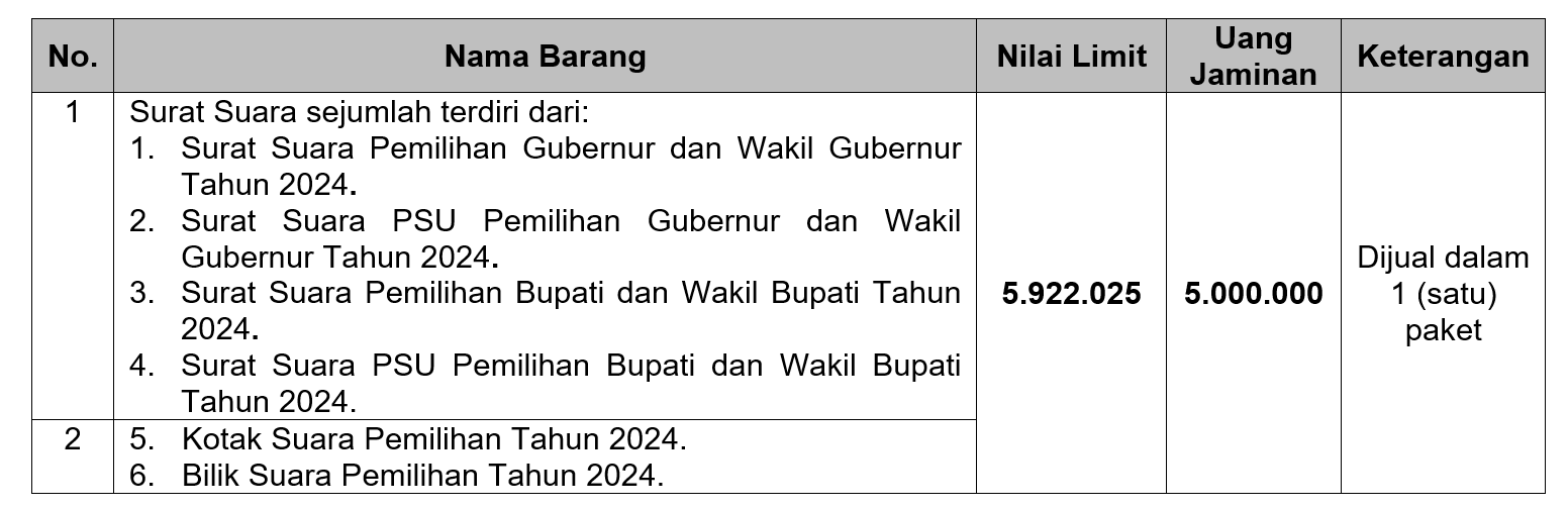 1 (satu) paket Barang Milik Negara Exs. Logistik Pemilihan Serentak Tahun 2024 berupa Surat Suara, Kotak Suara dan Bilik Suara Berbahan Kardus/Dupleks, dengan berat total ± 5.832,50.