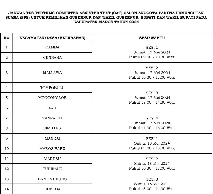 JADWAL TES TERTULIS COMPUTER ASSISTED TEST (CAT) CALON ANGGOTA PANITIA PEMUNGUTAN SUARA (PPS) UNTUK PEMILIHAN GUBERNUR DAN WAKIL GUBERNUR, BUPATI DAN WAKIL BUPATI PADA KABUPATEN MAROS TAHUN 2024