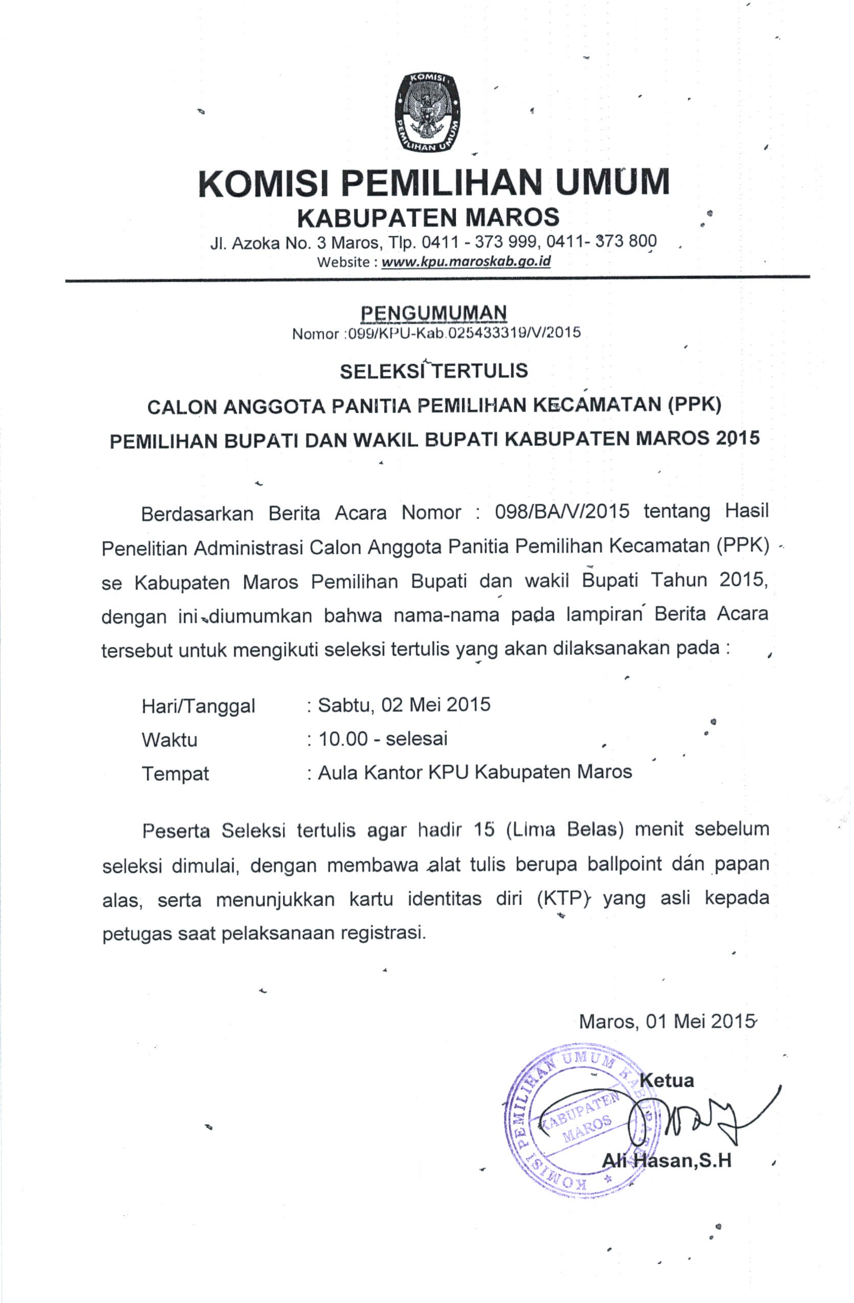 Pengumuman Jadwal Seleksi Tertulis Calon Anggota Panitia Pemilihan Kecamatan (PPK) Pemilihan Bupati Dan Wakil Bupati Tahun 2015