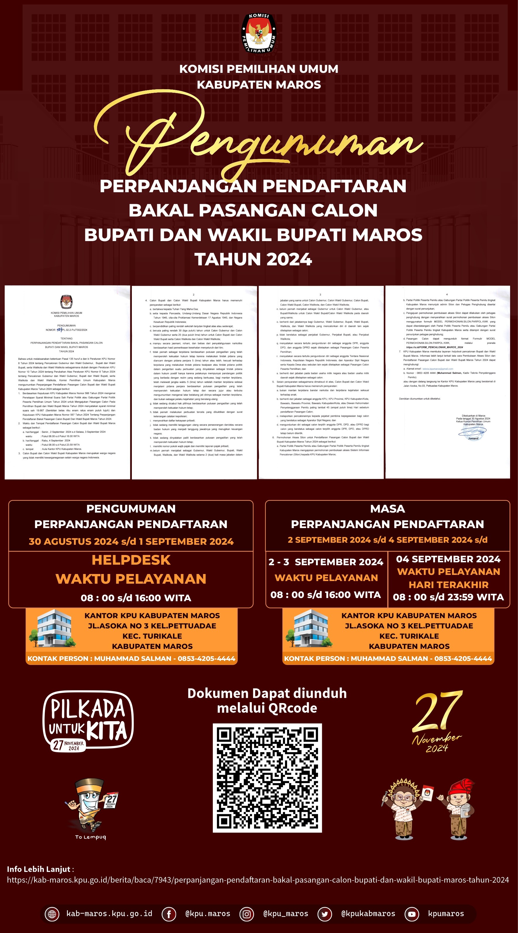 Komisi Pemilihan Umum Kabupaten Maros mengumumkan perpanjangan Pendaftaran Bakal Pasangan Calon Bupati dan wakil Bupati kabupaten Maros.