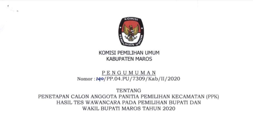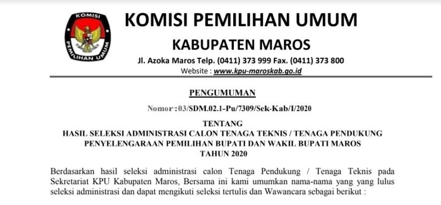 Berdasarkan hasil seleksi administrasi calon Tenaga Terknis/Tenaga Pendukung pada sekertariat KPU Kabupaten Maros, Bersama ini kami umumkan nama-nama yang lulus seleksi administrasi dan dapat mengikuti seleksi tertulis dan wawancara, nama-nama yang lolos.