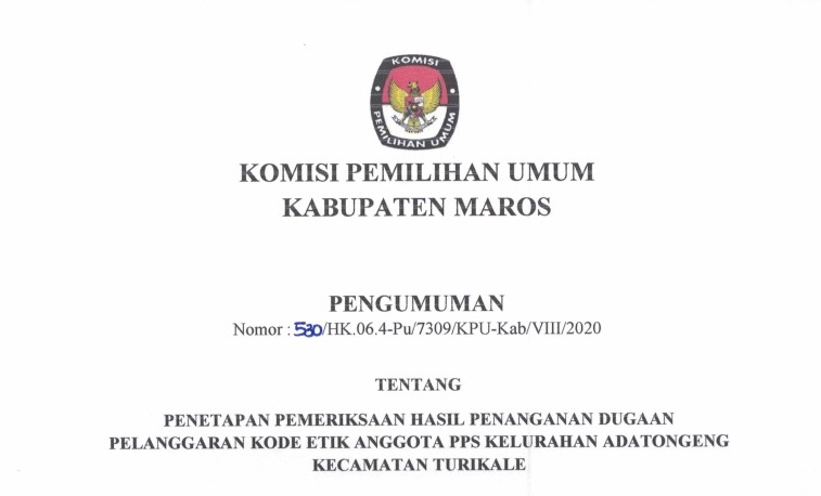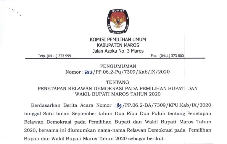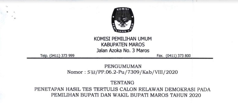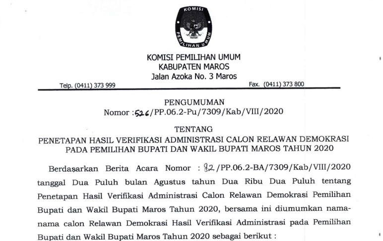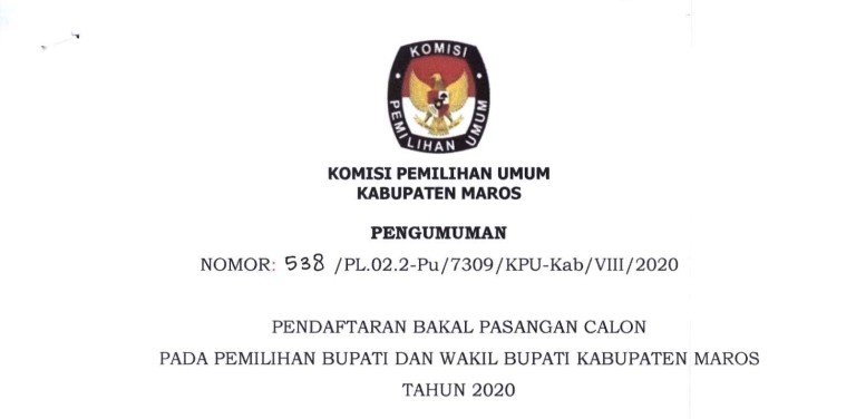 Berikut dokumen syarat pencalonan dan syarat calon bakal pasangan calon Bupati dan Wakil Bupati pada PilkadaMaros 2020. Diharapkan kepada masyarakat Maros untuk memberikan tanggapannya sejak dokumen ini diumumkan sampai tanggal 8 September 2020.