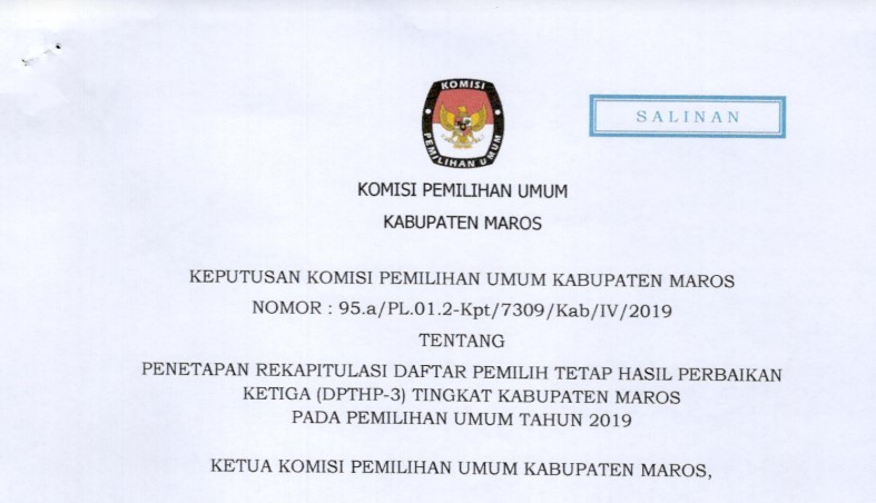 SK Penetapan Rekapitulisasi Daftar Pemilih Tetap Hasil Perbaikan ketiga (DPTHP-3) KPU KAB.MAROS Pada Pemilu 2019 Senin, 04 Maret 2019 00:00 25 Baca Selengkapnya
