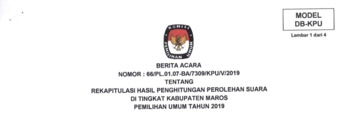 PENGUMUMAN REKAPITULASI HASIL PENGHITUNGAN PEROLEHAN SUARA DI TINGKAT KABUPATEN MAROS PEMILU TAHUN 2019 Senin, 06 Mei 2019 00:00 49 MODEL DB-KPU MODEL DB1-PPWP MODEL DB1-DPR MODEL DB1-DPD MODEL DB1-DPRD PROVINSI MODEL DB1-KAB/KOTA MAROS 1 MODEL DB1-KAB/KOTA MAROS 2 MODEL DB1-KAB/KOTA MAROS 3 MODEL DB1-KAB/KOTA MAROS 4 MODEL DB1-KAB/KOTA MAROS 5 Baca Selengkapnya