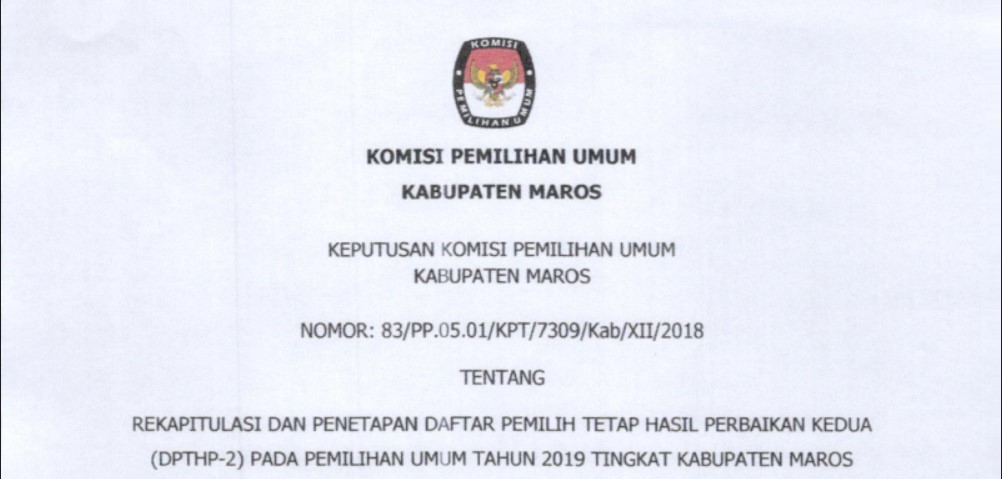 PENGUMUMAN RELAWAN DEMOKRASI PADA PEMILIHAN UMUM TAHUN 2019 SE-KABUPATEN MAROS Jumat, 18 Januari 2019 00:00 25 Pengumuman Nama-nama yang Lulus sebagai Relawan Demokrasi Komisi Pemilihan Umum (KPU) Kabupaten Maros pada Pemilihan Umum Tahun 2019. Baca Selengkapnya