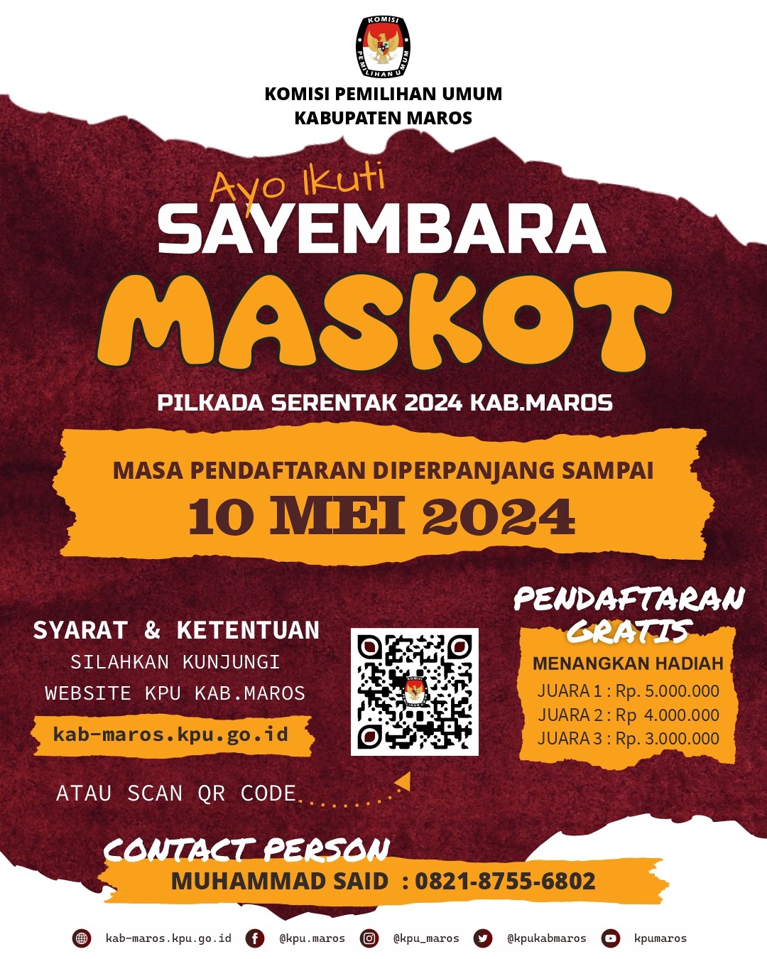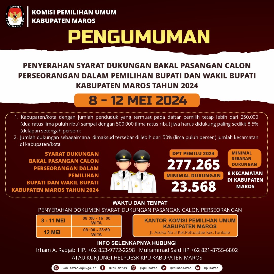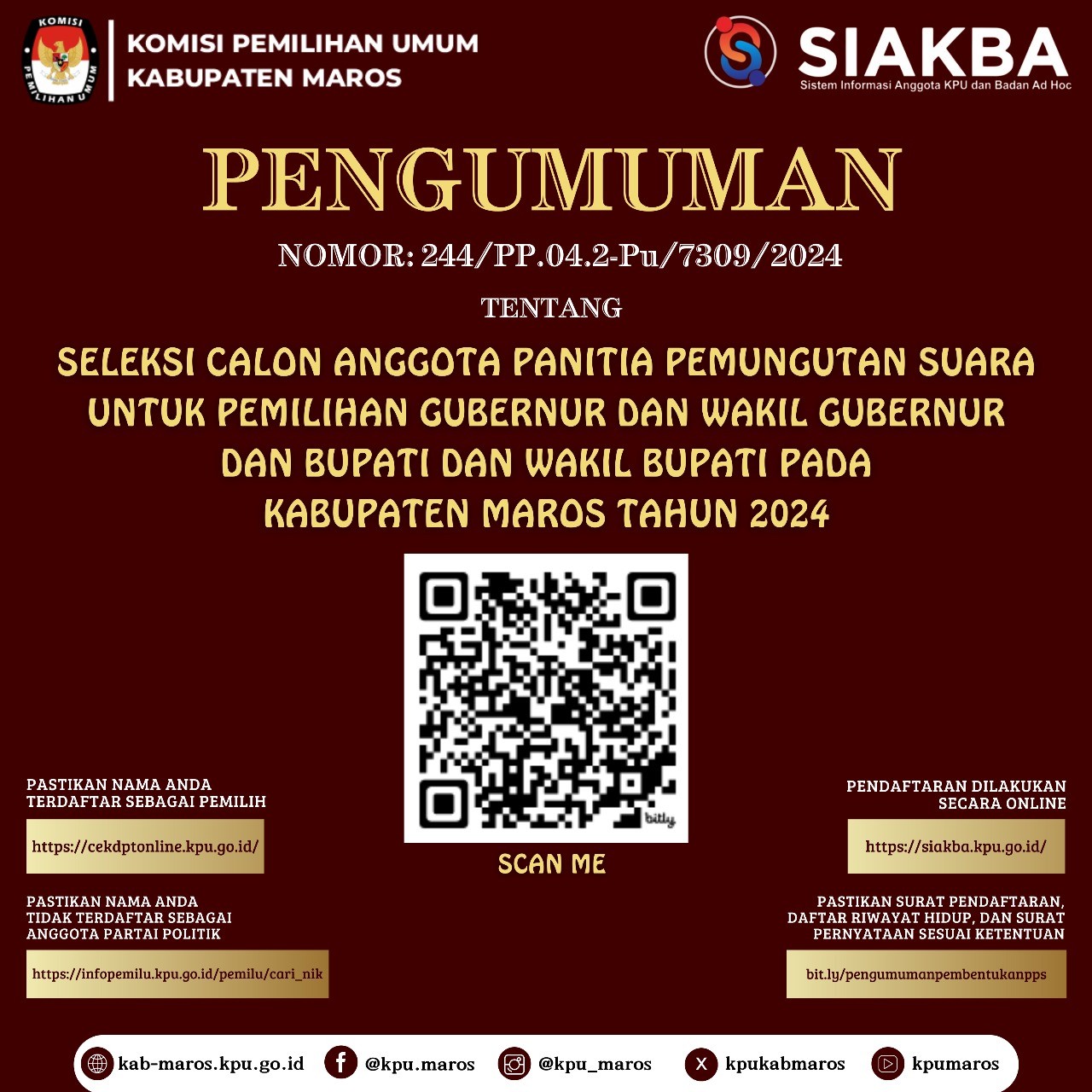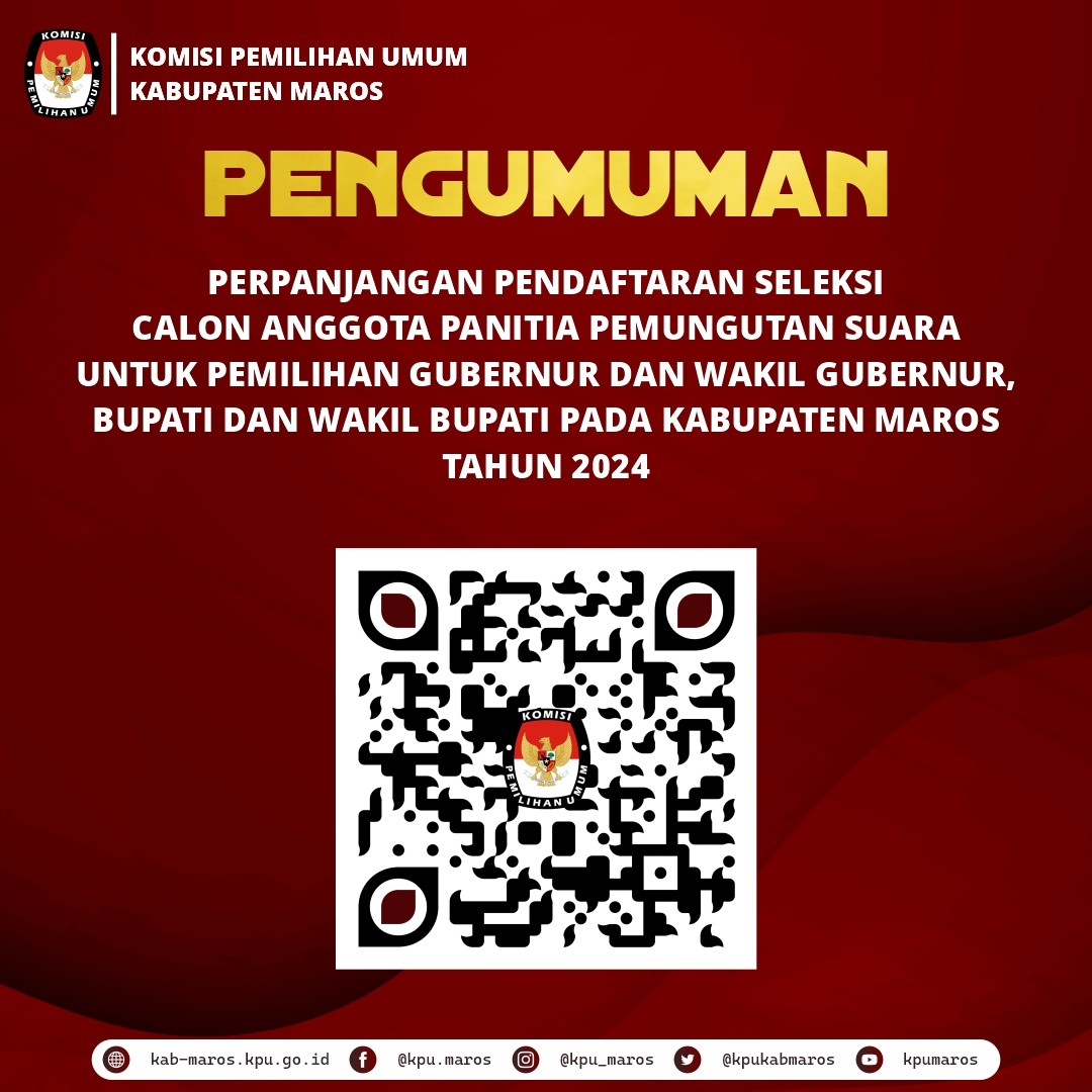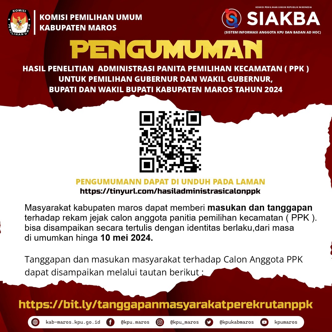 Komisi Pemilihan Umum Kabupaten Maros membuka tanggapan dan masukan bagi masyarakat terhadap Calon Anggota Panitia Pemilihan Kecamatan sejak tanggal 4 Mei 2024 sampai dengan 10 Mei 2024. Tanggapan dan masukan masyarakat terhadap Calon Anggota PPK dapat disampaikan melalui tautan berikut bit.ly/tanggapanmasyarakatperekrutanppk.