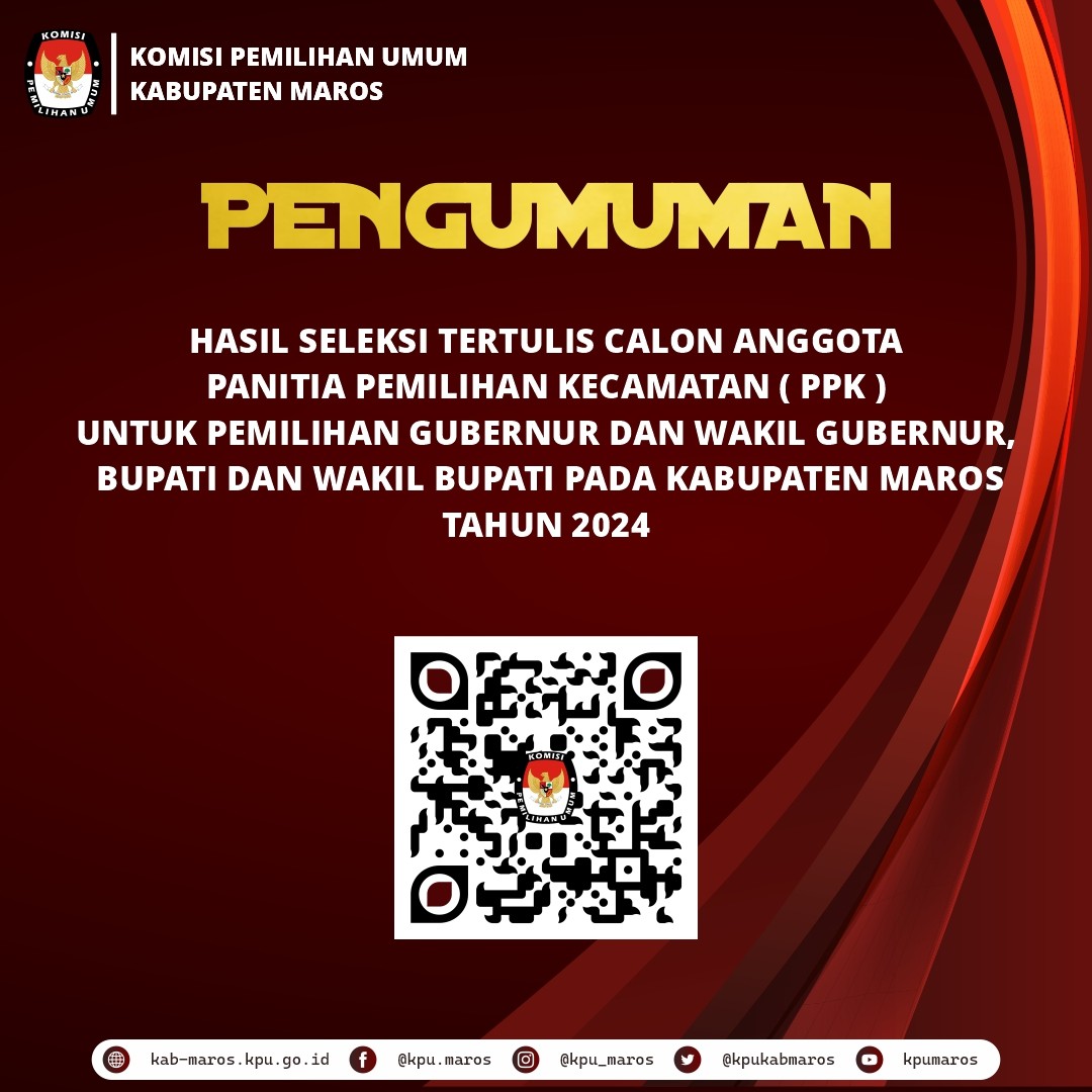 Sehubungan dengan hal tersebut di atas, Komisi Pemilihan Umum Kabupaten Maros mengundang calon anggota Panitia Pemilihan Kecamatan yang dinyatakan Memenuhi Syarat untuk hadir dan mengikuti Seleksi Tertulis Calon Anggota Panitia Pemilihan Kecamatan pada: