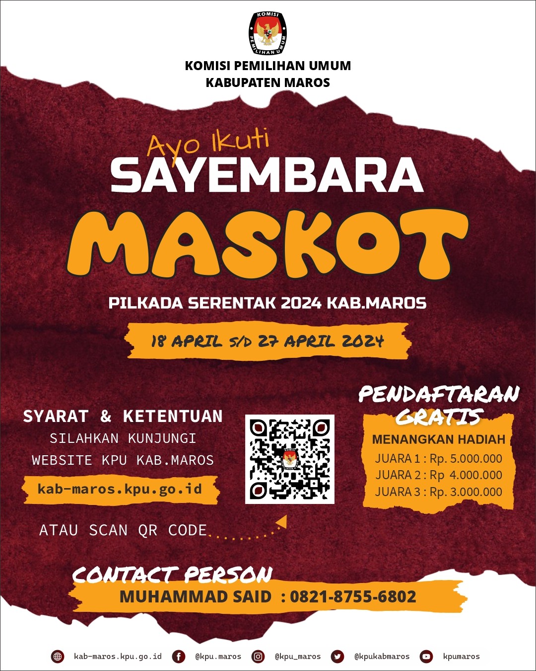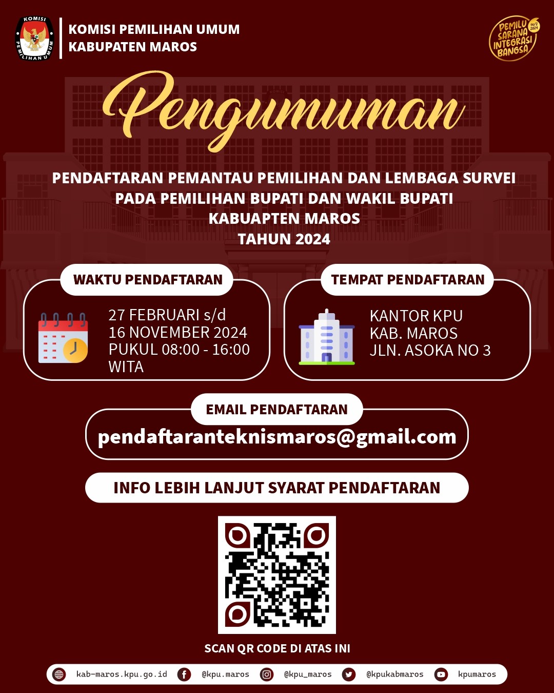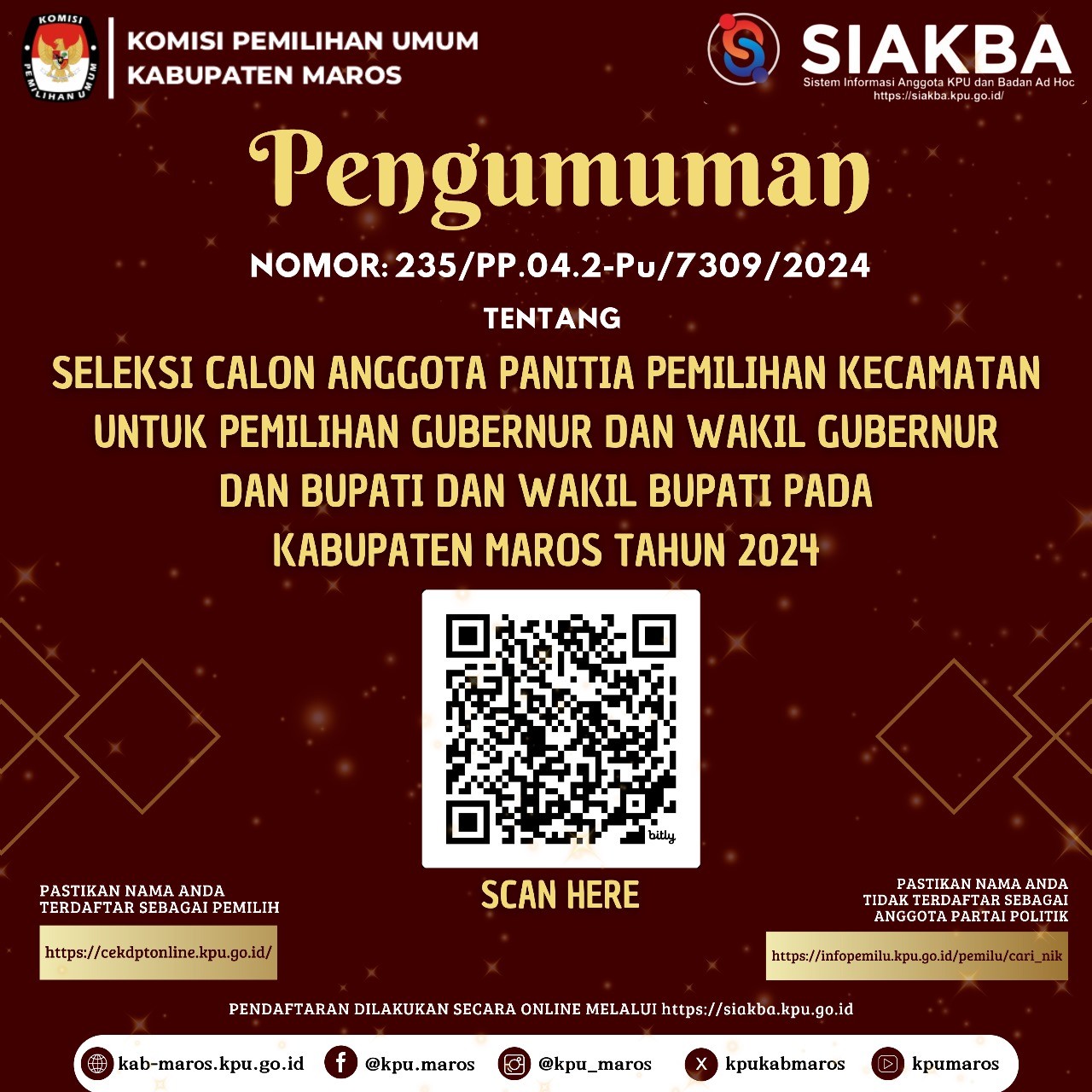 Maros, kab-maros.kpu.go.id Dalam rangka pembentukan Calon Anggota Panitia Pemilihan Kecamatan untuk Pemilihan Gubernur dan Wakil Gubernur, Bupati dan Wakil Bupati, dan Wali Kota dan Wakil Wali Kota Tahun 2024, Komisi Pemilihan Umum Kabupaten Maros mengundang Warga Negara Indonesia yang memenuhi kualiflkasi untuk mendaftarkan diri menjadi Panitia Pemilihan Kecamatan untuk Pemilihan Gubernur dan Wakil Gubernur, Bupati dan Wakil Bupati, dan Wali Kota dan Wakil Wali Kota dengan ketentuan sebagai berikut: